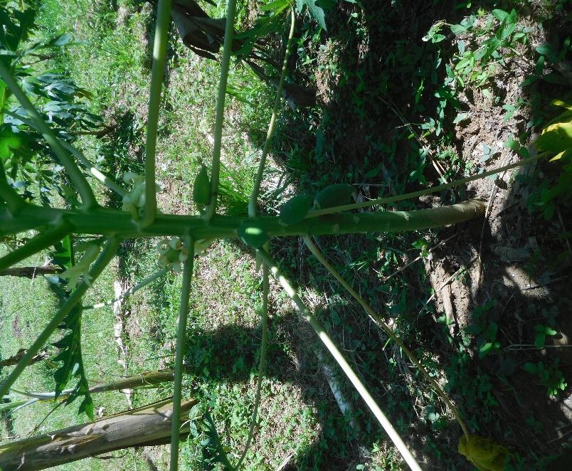 Epifanio plant papaya in, tussen twee korte nieuwe rijen bakbananen. Rechts niet alleen twee cassaveplanten, maar ook twee klimbonende zg zaragosa, die in de rijst meegebakken gekookt een mooi product oplevert. Margarita oogst met enige fre4quentie.